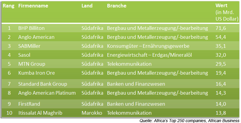 Mit einem Wert von 75,5 Mrd. US Dollar führt das südafrikanische Unternehmen BHP Billiton die Rangliste deutlich an. Unter den Top-10 befindet sich nur ein Unternehmen, das seine Wurzeln nicht im südlichsten Staat Afrikas hat: Die Telekommunikationsfirma Itissalat Al Maghrib aus Marokko (13,8 Mrd. US Dollar). Vier der ersten Zehn sind im Sektor Bergbau und Metallerzeugung/-bearbeitung zuhause.