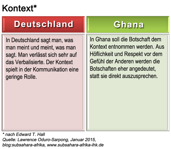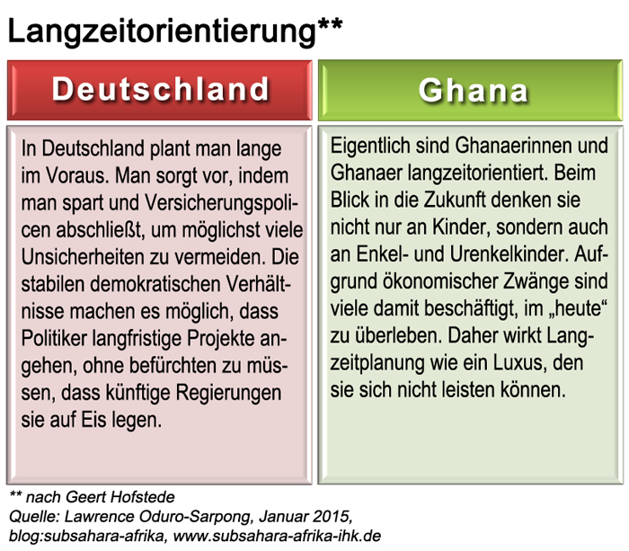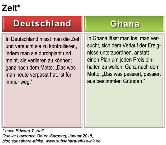 Da die Religion aufgrund der Spiritualität eine gewaltige Rolle gerade im Geschäftsleben der Ghanaerinnen und Ghanaer spielt, kommt es vor, dass zum Beispiel ein muslimischer Geschäftsmann eine Besprechung unterbricht, um pünktlich zur Gebetszeit zu beten. Dies stößt oft auf Unverständnis, lässt den deutschen Geschäftspartner an der Seriosität des ghanaischen Partners zweifeln und führt zu Ärger. Wenn in einem von einem Deutschen und einem Ghanaer geführten Unternehmen etwas schief läuft, kommt es oft vor, dass sich der deutsche Partner darum bemüht, die Schuldigen für das Scheitern zu identifizieren, um das Problem zu klären, während sein ghanaischer Partner den Blick nach vorne richtet, um die Zukunft besser zu gestalten und auch für eine gute Arbeitsatmosphäre zu sorgen. Eine solche Situation kann dazu führen, dass der Deutsche seinem ghanaischen Partner misstraut, während der Ghanaer sich darüber ärgert, dass es seinem deutschen Partner nicht wichtig ist, dass eine harmonische Atmosphäre im Unternehmen herrscht.