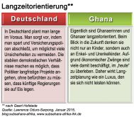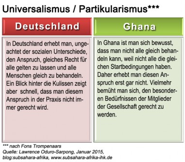 Deutsche und Ghanaerinnen und Ghanaer haben die Gemeinsamkeit, dass sie ihr Land mögen. Auch das „Chilling“ haben sie gemeinsam, indem sie nach Feierabend oder am Wochenende in die Bar oder Kneipe gehen, um mit Freunden etwas zu trinken. An Feiertagen unternimmt man gerne etwas, man veranstaltet ein Picknick oder man fährt an den See oder Strand um zu feiern. Unterschiede gibt es aber reichlich. Als spirituelles Volk nehmen es die Ghanaerinnen und Ghanaer sehr ernst mit der Religion, sei es mit dem Christentum, Islam oder anderen Religionen. Sonntags gehen auch junge Menschen zahlreich in die Kirche, während man in Deutschland eher Senioren und Kleinkinder antrifft. Auch bei Arbeitssitzungen wird in Ghana nicht selten vorher und nachher gebetet. Ghanaerinnen und Ghanaer sind harmonieorientiert, während Deutsche zur Schuld- und Problemorientierung neigen. Die Trennung von Männer- und Frauenrollen findet in der ghanaischen Gesellschaft auch bei Akademikerinnen Zustimmung, während sich die Rollen in Deutschland zunehmend vermischen.