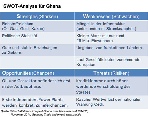 Welche Stärken und Schwächen die Märkte Ghana und Nigeria haben und welche Marktpotenziale sich für 2015 offenbaren, zeigen die folgenden Grafiken: