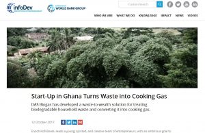 infoDev, eine Initiative der Weltbankgruppe, die Gründer in Entwicklungsländern unterstützt, berichtet in ihrem Artikel “Start-Up in Ghana Turns Waste into Cooking Gas” (12.10.2017) über den jungen Ghanaer Enoch Kofi Boadu, der ein dezentrales System zur Aufbereitung von organischen Haushaltsabfällen zu Biogas und Dünger entwickelt hat. Das System kann bis zu 70 % des Gasbedarfs einer Familie zum Kochen decken und soll sich auch für den Einsatz in Gemeinden und Städten eignen, so Boadu.