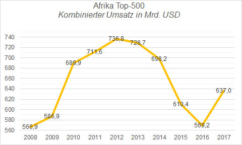 Die erfolgreichsten 500 Unternehmen des afrikanischen Kontinents sind 2017 wieder gewachsen. Knapp 12 Prozent konnten sie im Vergleich zum Vorjahr an Umsatz gut machen und verdienten zusammengerechnet 637 Mrd. US-Dollar. Dennoch liegt dieser Wert etwa 100 Mrd. US-Dollar unter dem 2012 erwirtschafteten Höchstwert der letzten Dekade im Jahre 2012 (737 Mrd. USD). Hauptursache für den Umsatzrückgang seit 2012 mit Tiefpunkt in 2016 (569 Mrd. USD) waren insbesondere Währungsschwankungen und –abwertungen sowie niedrige Preise für Rohstoffe.
